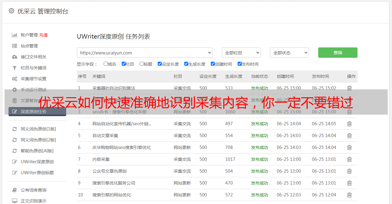 总之,优采云是一个非常有用的SEO优化工具。它能够快速准确地识别内容并整理成标准格式;此外,它还能对内容进行分析、去重和SEO优化。如果你想要快速准确地获取信息并收集数据,那么你一定不要错过使用优采云这个神奇的工具。