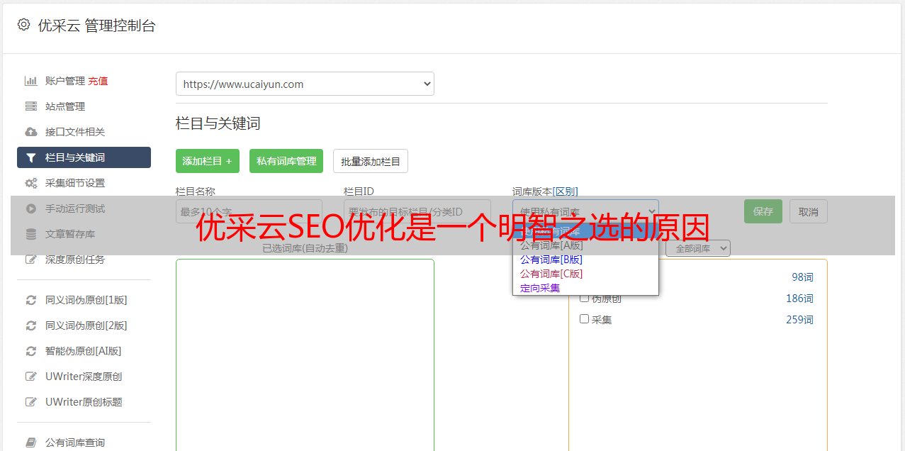 优采云SEO优化是一款功能强大的SEO伪原创视频制作工具,旨在帮助企业制作出吸引眼球、具有吸引力、能够有效提升流量的视频内容。它具备多种功能,如原创文章生成、文章改写、文章语法检查、图片上传等,可以帮助企业快速生成SEO伪原创视频内容。
