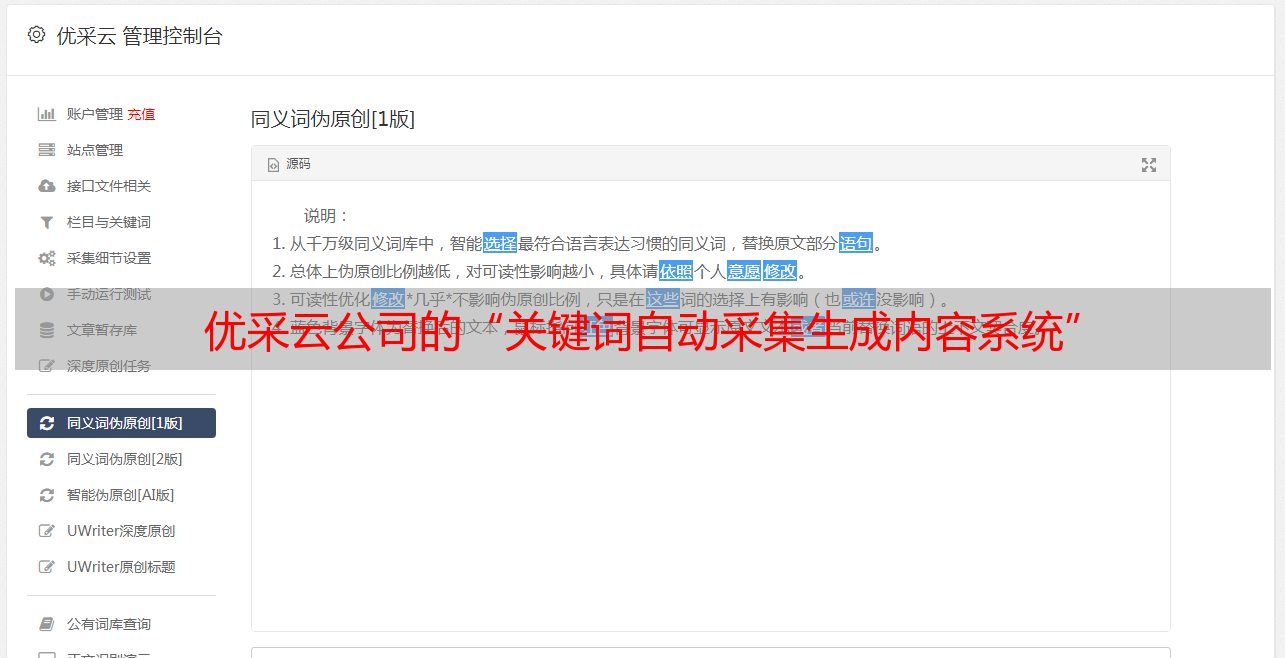 优采云公司的“关键词自动采集生成内容系统”是一款能够根据用户输入的关键词自动采集相应内容并生成文章的系统。用户只需在优采云官网www.ucaiyun.com上注册并下载该系统,然后在界面上输入想要生成文章的关键词,就可以根据该关键词从各大平台上采集到相应的内容并将之整合生成一篇新文章。这样就不必手工添加内容了,既省时又省力,还能保证文章中所包含的信息都是有效、正确、有价值的。