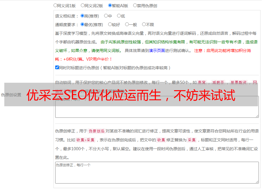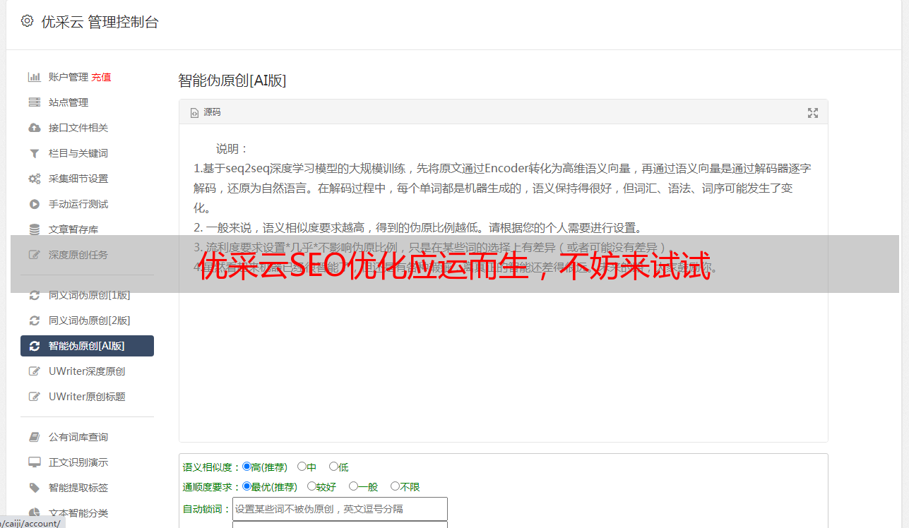总之,优采云SEO优化是一个强大的内容技术工具,不仅可以帮助用户快速、准确地检测出文章中的重复和相似性,还可以帮助用户快速生成不含重复和相似性内容的文章、将广告信息嵌入文章中、将图片信息嵌入文章中等。如果你正在寻找一个强大而又好用的内容工具来帮助你进行SEO优化,不妨来试试优采云SEO优化吧。它的官网www.ucaiyun.com上都有相应的使用说明和教程供你学习使用。
