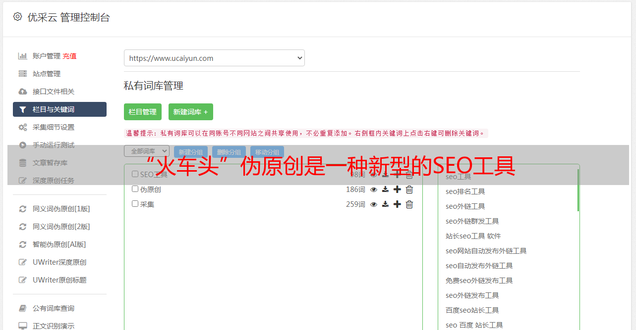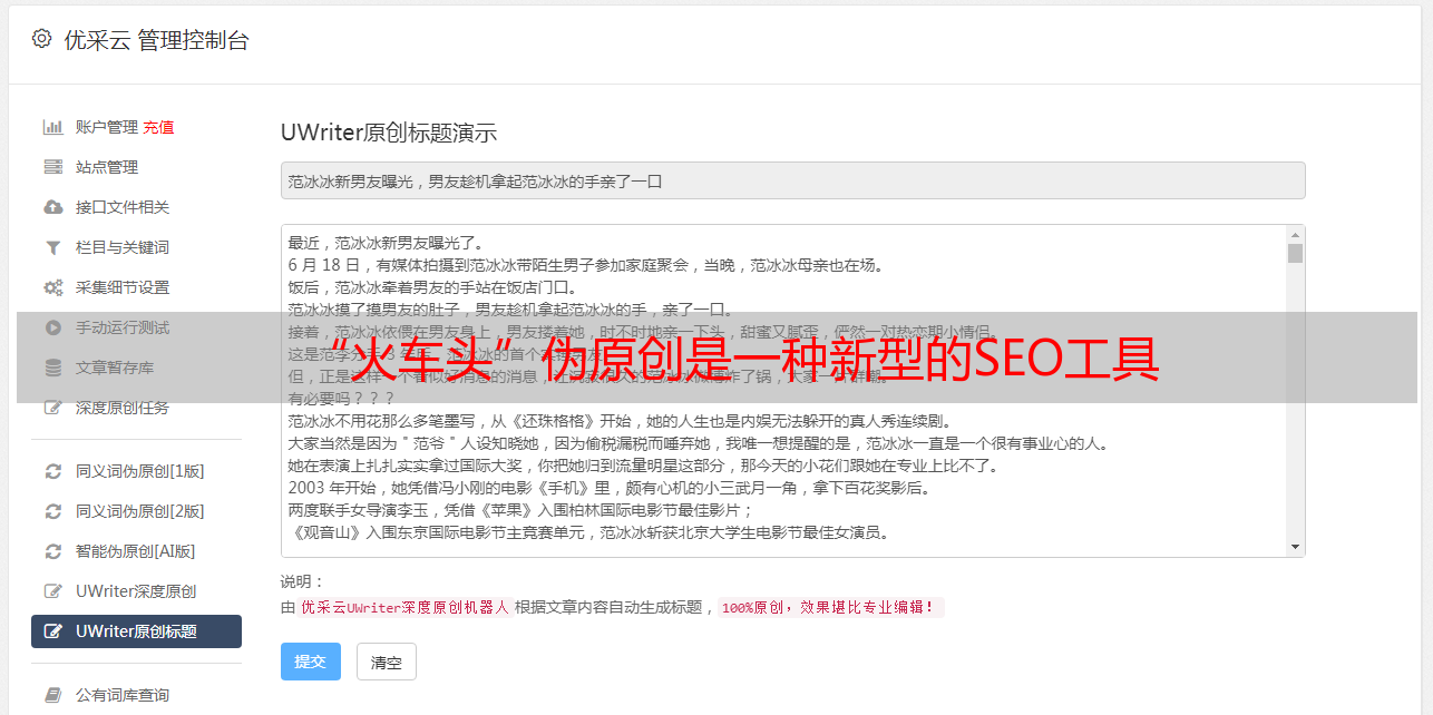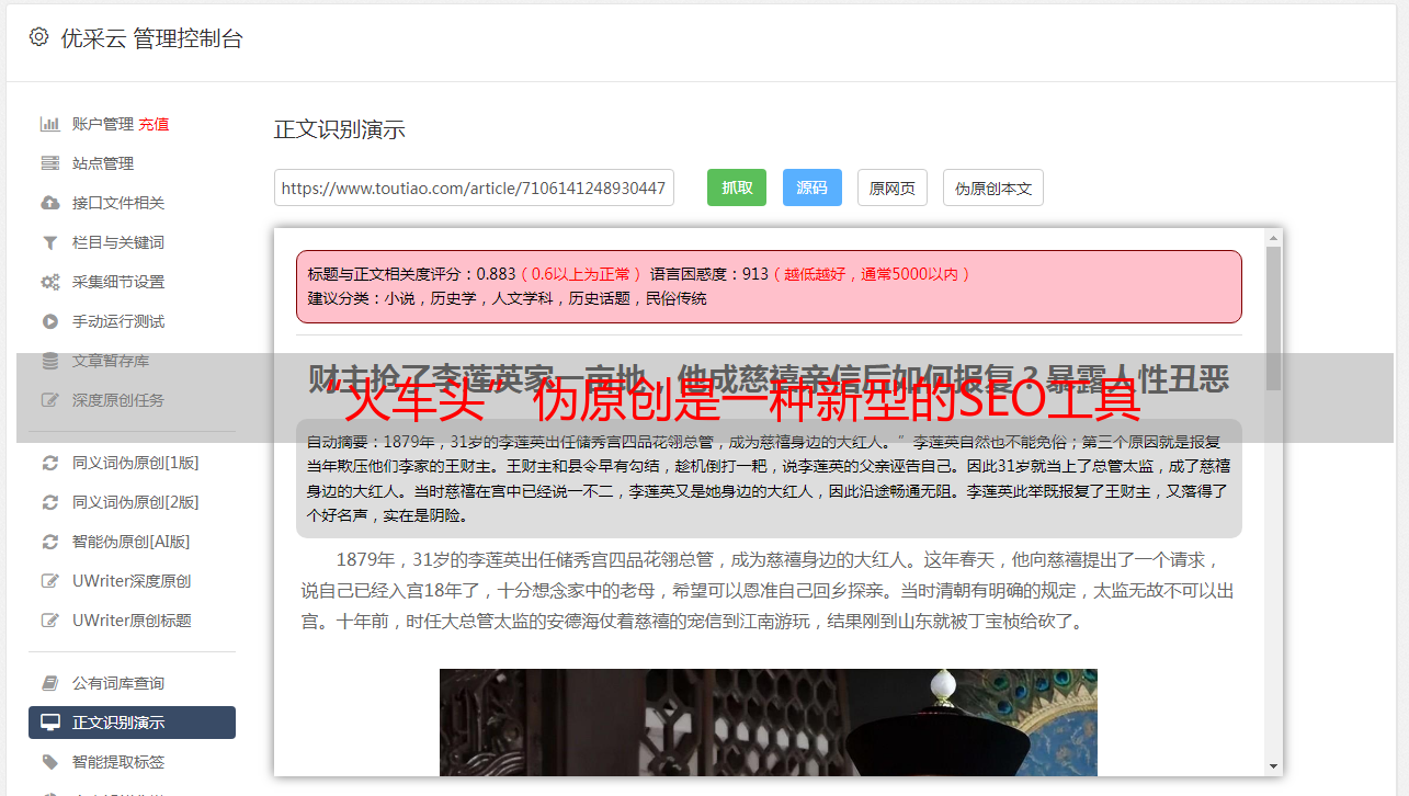 总之,使用“火车头”伪原创工具能帮助用户减少人力和时间上学习SE0 的难度,帮助用户快速生成大量不同形式、不同语法、不同风格、不同思想新颖度的原创内容。如想体验“火车头”伪原创带来便利之道,就来体验国内最大 SEO 平台——《优采云》(www.ucaiyun.com )吧!
