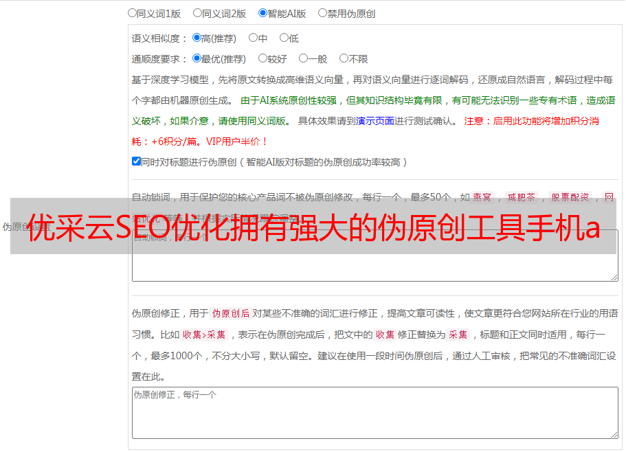 优采云SEO优化是一款特别的伪原创工具手机app,它可以帮助用户快速生成高质量的文章内容。它可以根据用户输入的关键词,快速生成原创文章内容,并将其排版整理好,使文章看起来更加精美、专业。同时,它还能够根据不同关键词生成不同文章内容,从而避免文章重复内容过多而影响文章质量。