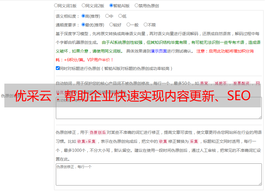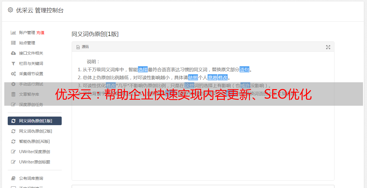优采云是一个全自动数据采集平台,可以根据关键词快速获取相关信息、图片、视频等数据,并将这些数据进行分析处理后生成原创内容。用户可以选择不同的关键词、不同的内容样式、不同的生成方式来生成相应的原创内容。此外,优采云还能够将所生成的原创内容及时推送到各大平台上,有效地帮助企业进行SEO优化。