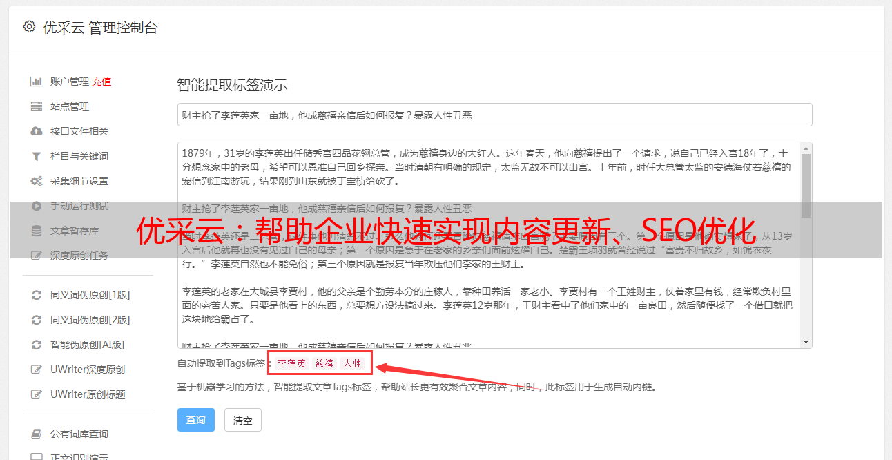 此时,关键词自动采集生成内容系统——优采云应运而生,它能够帮助企业快速实现内容更新、SEO优化,无需任何打理。