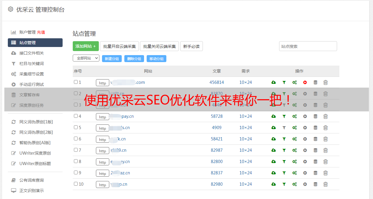 总而言之,使用优采云SEO优化软件可以帮助伪原创站长快速、有效地实现SEO目标。它不但能够快速生成原创文章,还能对内容和图片进行优化,使其更有吸引力和可读性。如果你想要快速、有效地实现SEO目标,不妨考虑使用优采云SEO优化软件来帮你一把!要了解有关详情,可前往www.ucaiyun.com 了解更多信息。