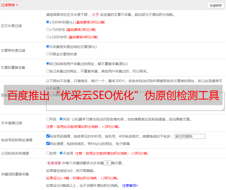 为此,百度特别推出了一款名为“优采云SEO优化”的伪原创检测工具,旨在帮助用户迅速识别出内容中存在的伪原创成分。该工具可以有效地帮助用户识别出内容中存在的伪原创成分,并将其归为“低保真”、“中保真”、“高保真”三大类,以便用户对内容进行相应的修正。