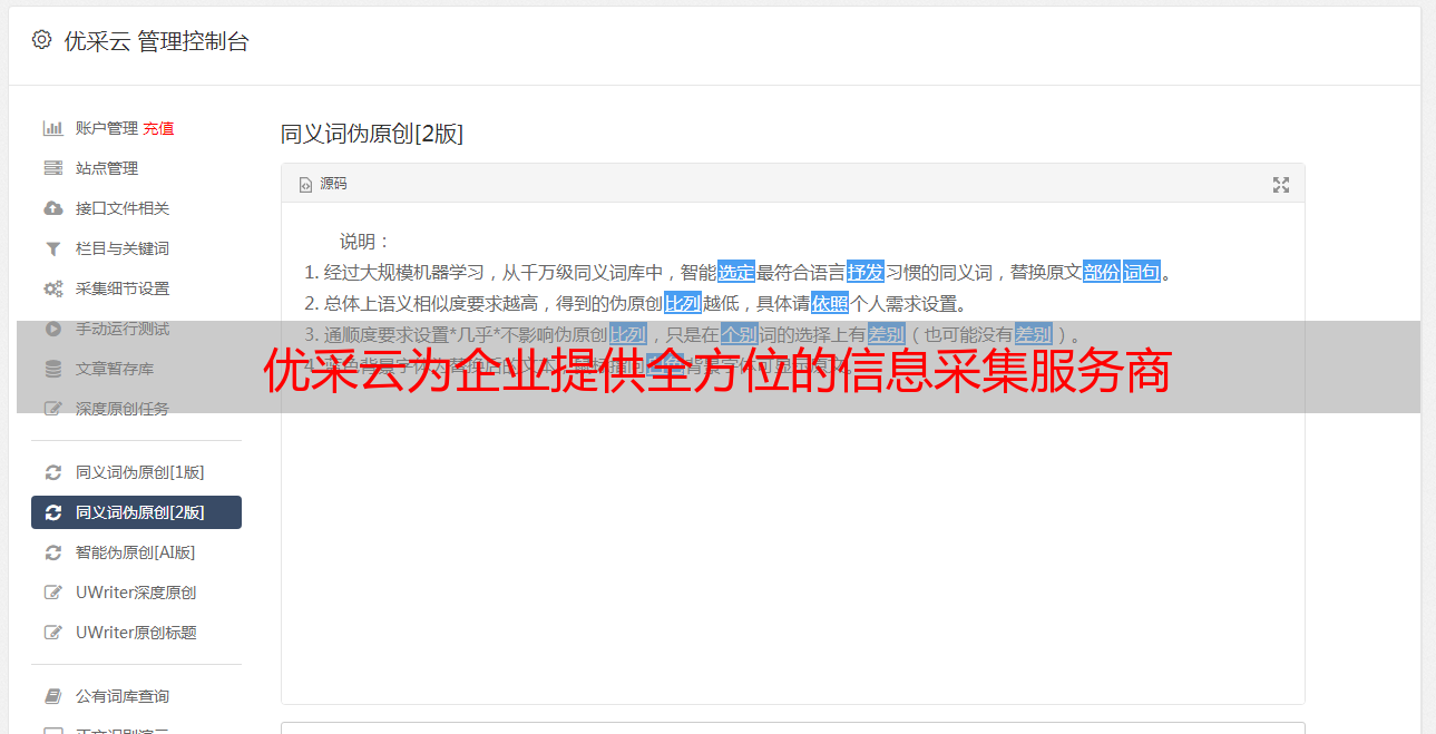 优采云是一家专业的信息采集服务商,它以先进的技术和丰富的经验为企业提供全方位的信息采集服务。它针对不同行业和领域,能够快速准确地从各大网站上采集出所需要的数据。此外,它还可以帮助企业解决SEO优化问题。通过强大的数据分析功能,优采云可以帮助企业快速理解用户行为,并根据用户行为来调整相应的SEO优化方法,从而使企业在各大平台上获得有竞争力的市场地位。