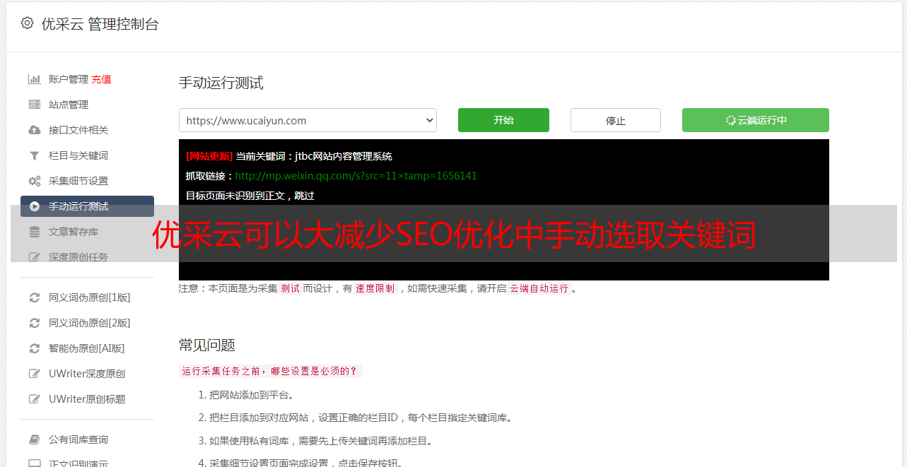 优采云是一款专业的SEO优化工具,它可以帮助用户快速准确地采集合适的关键词,并可以根据用户填写的信息进行分析和判断,有效地帮助用户避免使用不合适或不相关的关键词。