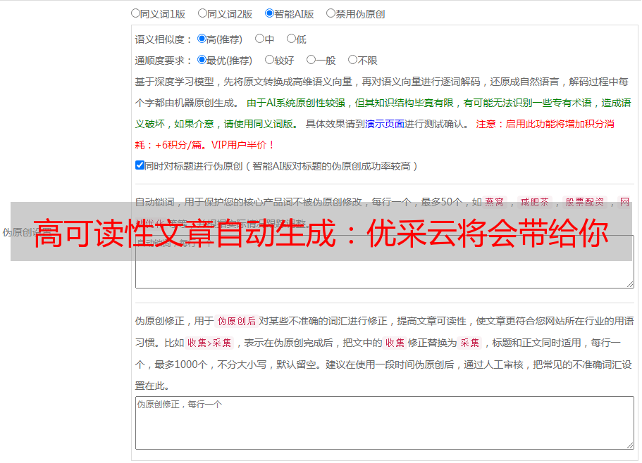 优采云 发布时间: 2023-01-30 06:27高可读性文章自动生成:优采云是一款革命性的新型软件,它的出现使得文章的质量大大提高。它可以让用户根据自己的要求自动生成高可读性文章,而且这种文章的内容不仅有用而且还具有很强的SEO优化。