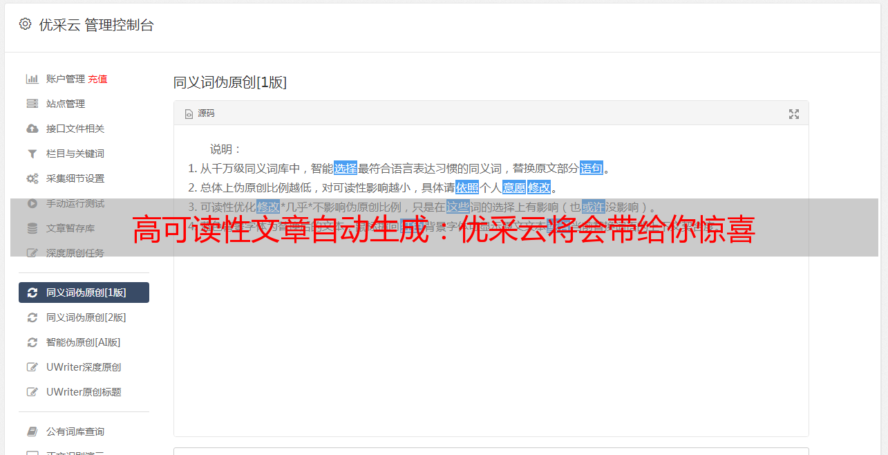 优采云不仅能够帮助用户快速生成文章,还能够帮助用户实现SEO优化。它采用了最先进的SEO技术,能够将文章中所包含的关键词合理地分布到不同位置,从而使得文章在搜索引擎上能够得到最大化的展示效果。