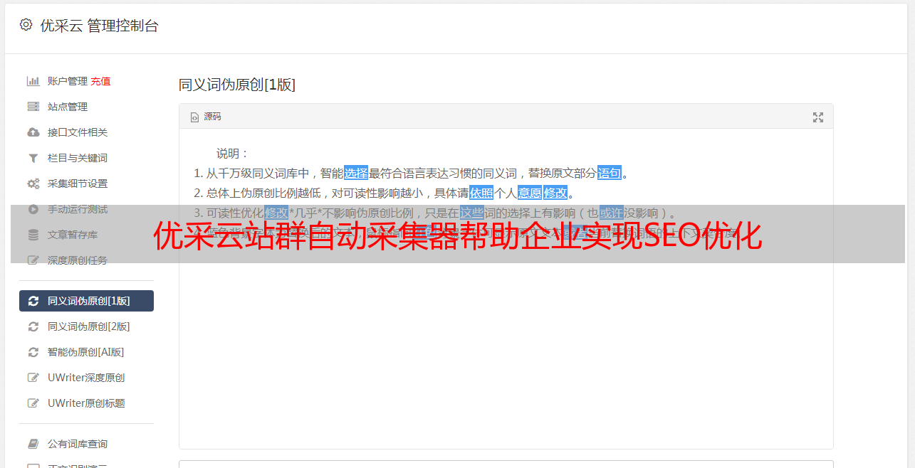总而言之,优采云站群自动采集器是一款十分出色的信息采集工具。它既能快速、准确地实行站群信息采集任务,又能帮助企业实施SEO优化;而且它还具有强大的安全防御能力、易于使用、无需特定水平就可使用的特性。如想要体验该工具的强大性能和便利性的话,不如前往官方网站www.ucaiyun.com 进行注册试用吧!