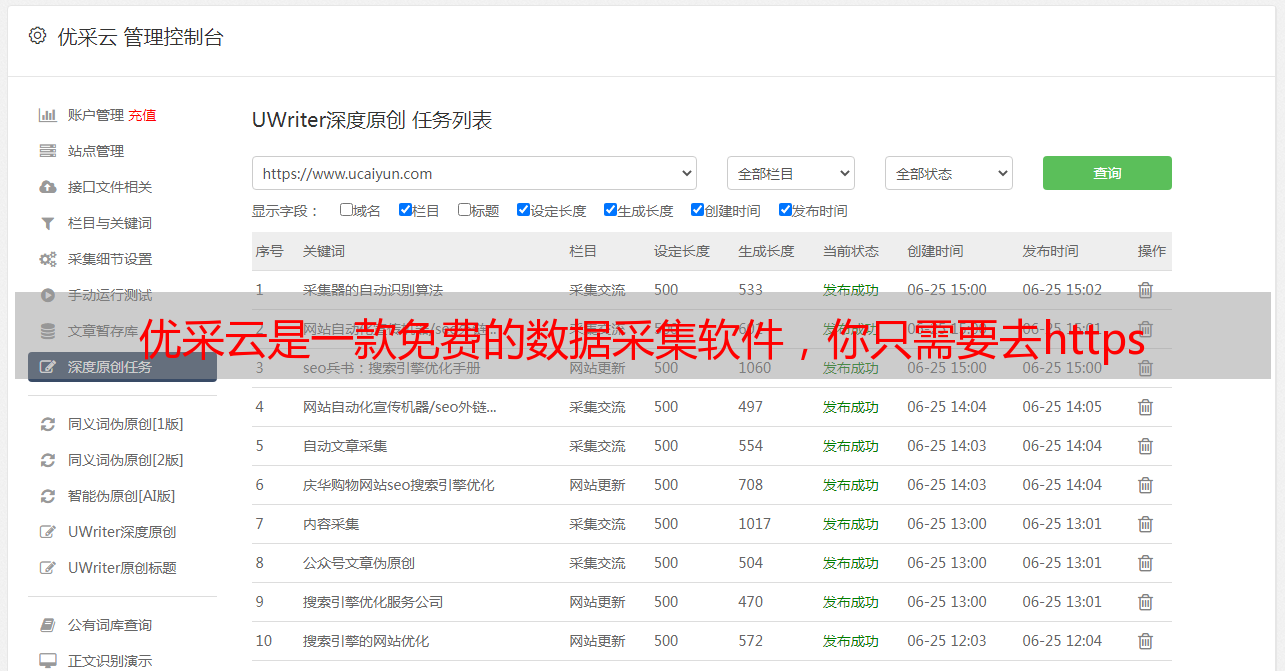 总之,作为一款免费而且功能强大的数据采集工具,优采云应该是你不可或缺的选择。它不仅能帮助你快速、准确地采集信息;同时也能保证你的数据安全性。如此一来,你就能省去大量时间和精力去做其他有意义的事情。如此看来,想要体验优采云带来的便利性,你只需要去https://www.ucaiyun.com/即可。