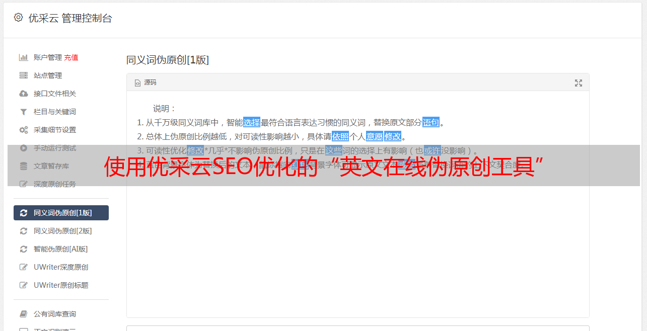 总之,使用优采云SEO优化上面的“英文在线伪原创工具”不仅可以快速生成高质量的新内容,而且还能帮助用户快速准确地实现SEO优化。如果你想要快速、有效地将你的英文网站打造得既有吸引力又有效益,就不要错过使用优采云SEO优化上面的“英文在线伪原创工具”了。想要了解更多信息,就赶快前往它们官方网站www.ucaiyun.com吧!