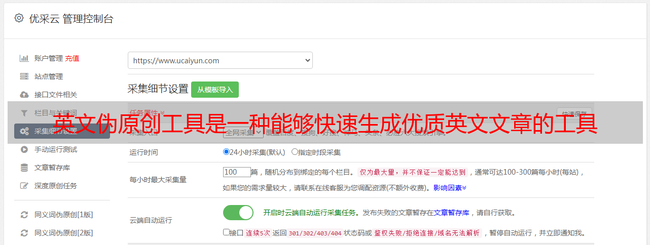 总之,优采云是一个功能强大、易于使用的英文伪原创工具,能够帮助用户快速生成高质量、有创意的英文内容。不仅如此,它还有一套强大而先进的SEO优化功能:根据用户所在行业和市场情况来分析并优化文章中使用的关键词;向文章中嵌入SEO标题、元数据和图片alt标签等信息。如果你想要尝试使用优采云来生成高质量、有创意的英文内容并提升SEO优化水平,就快快前往www.ucaiyun.com注冊吧~