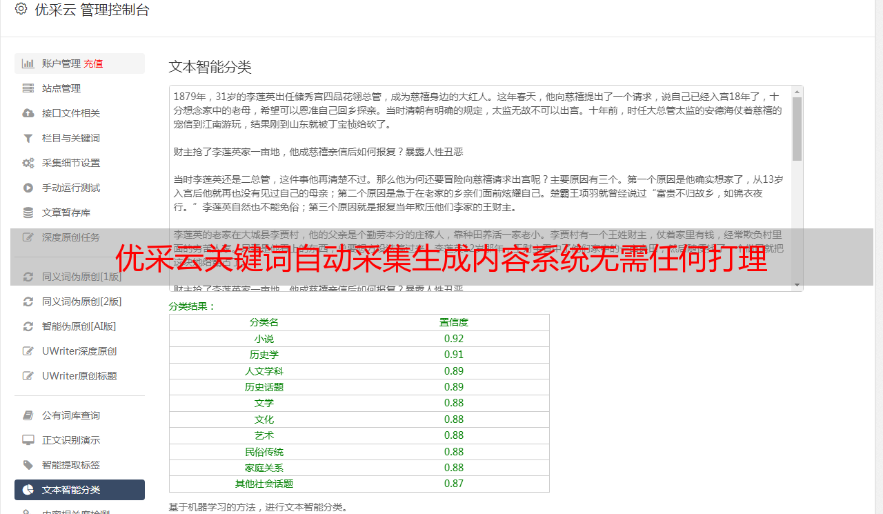 总之,优采云关键词自动采集生成内容系统无需任何打理就能够帮助用户快速、准确地将关键词转化为新闻、博客、文章等不同形式的优质内容;同时也能够帮助用户将其创作出来的新闻、博客、文章更好地呈现在搜索引擎上。如想要尝试使用优采云关键词自动采集生成内容系统来帮助你进行内容创作,请前往www.ucaiyun.com 进行注册使用。