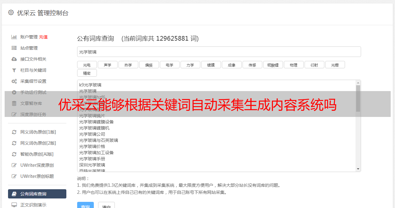 优采云就是一款强大的关键词自动采集生成内容系统。它能够根据用户提供的关键词和需要生成文章的形式,从各大平台中自动采集相应内容。然后,根据用户要求对内容进行快速整合,并将其根据不同的形式生成新文章,最后将新文章保存在用户的本地电脑上。