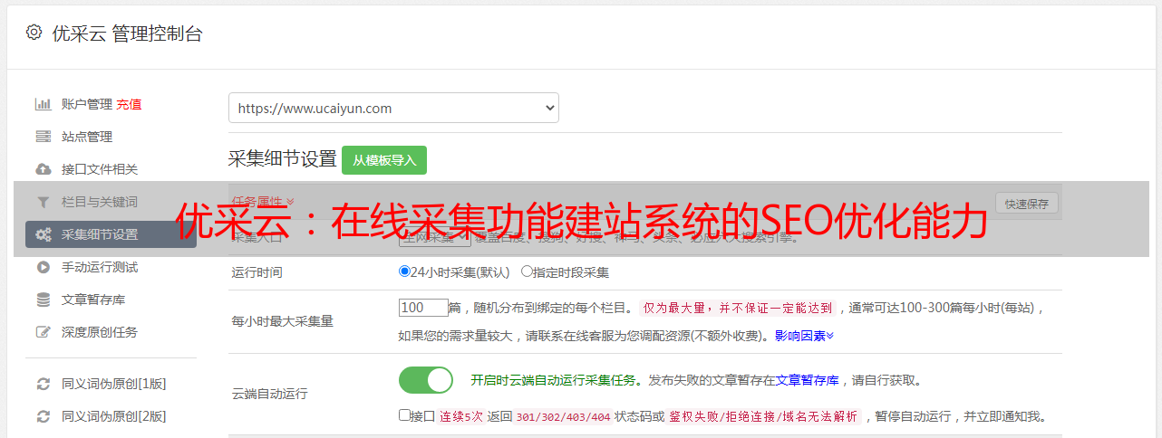作为一款新兴的在线采集功能建站系统,优采云(www.ucaiyun.com)正是帮助企业快速构建出具备SEO优化能力、流畅性能佳、性价比高的电子商务网站。它是一款多语言、多样式、多平台、多应用的文章在线采集功能建站系统。它不仅具有强大的内容采集、栏目生成、标题生成、详情页生成、新闻发布、数据分析、内容分发等功能,而且还具有SEO 优化功能(包括关键词优化、标题优化、内容优化、图片优化),可以帮助用户将信息迅速发布到各大搜索引擎中。