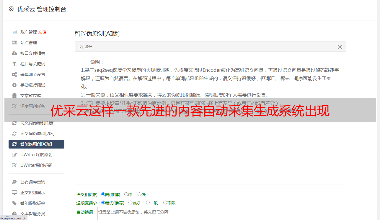 总之,优采云这样一款先进而便捷的内容自动采集生成系统不仅能够帮助用户快速、高效地生成原创性新闻内容,而且也能够对所生成的内容进行SEO优化来帮助电子商务平台上的商品得到有效展示。如想要体验优采云带来的便捷之道,请前往www.ucaiyun.com了解详情。