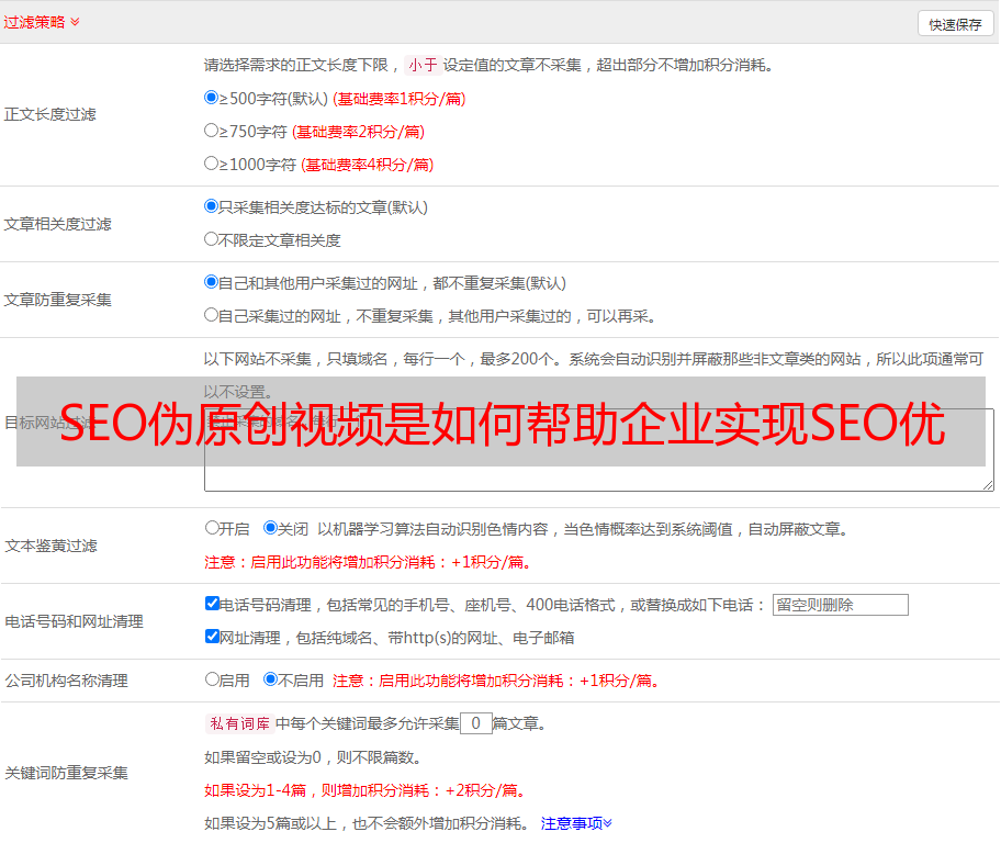 最后,SEO伪原创视频也能够帮助企业快速实现SEO优化。通过SEO伪原创视频表明关键词、标题、描述、标签、图片、URL等因素,可以很好地帮助该品。