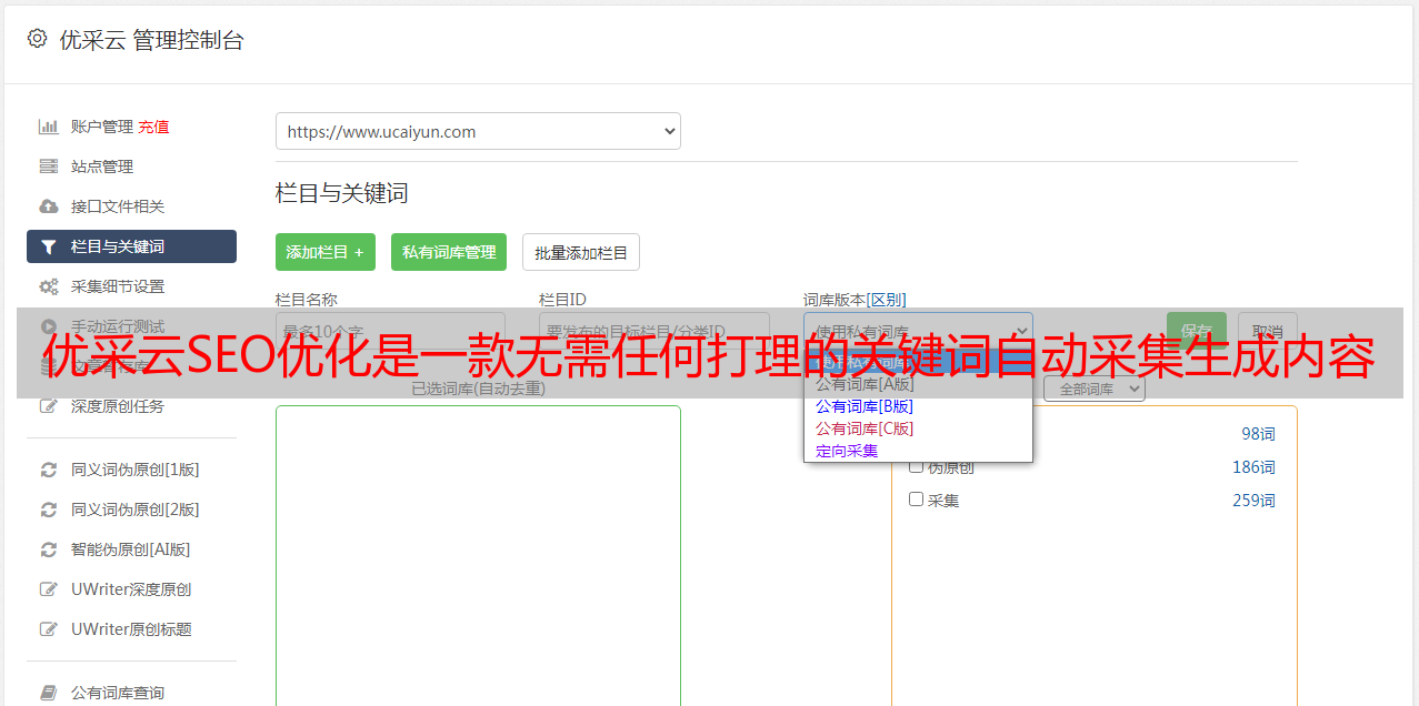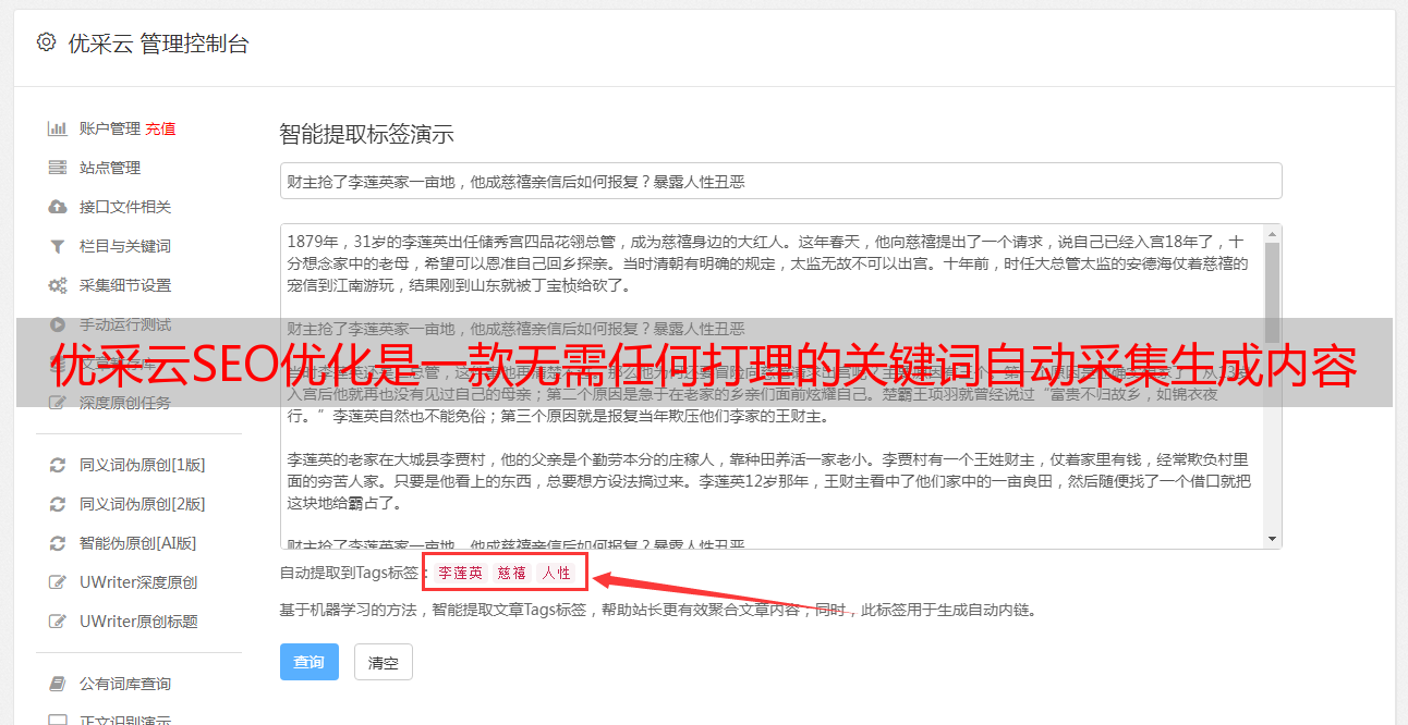 优采云SEO优化是一款无需任何打理的关键词自动采集生成内容系统
