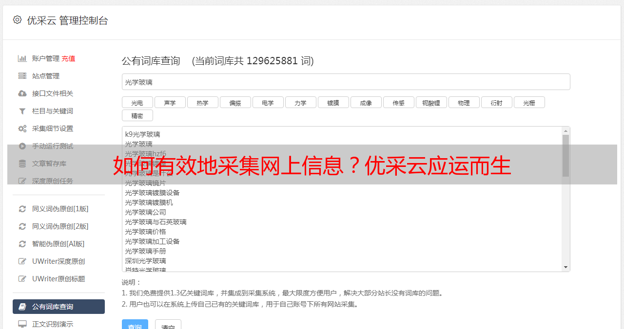 总之,优采云是一款可靠而强大的数据采集工具。它不仅能够快速准确地从各大平台中采集有价值的数据;此外,它也能对所采集到的数据进行分类和SEO优化;此外,它也能帮助用户快速在不同平台上获得有价值信息。如何将其应用于生意当中就需要大家去体验一番了:www.ucaiyun.com 。