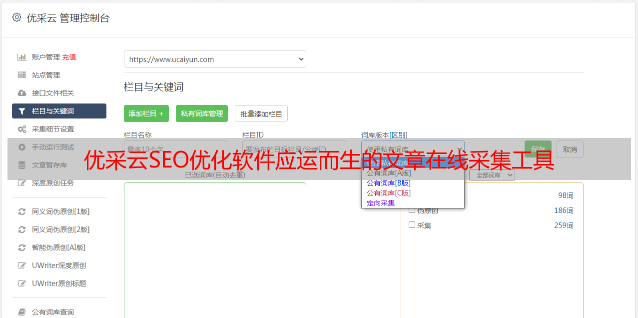 优采云SEO优化软件是一款功能强大的文章在线采集工具,它可以帮助用户快速搭建一个有吸引力的网站。该软件可以采集几乎所有流行的文章,如新闻、博客、论坛、微博、视频和图片,而且还可以根据用户的关键词进行定向采集,有效地提升用户网站的内容质量。