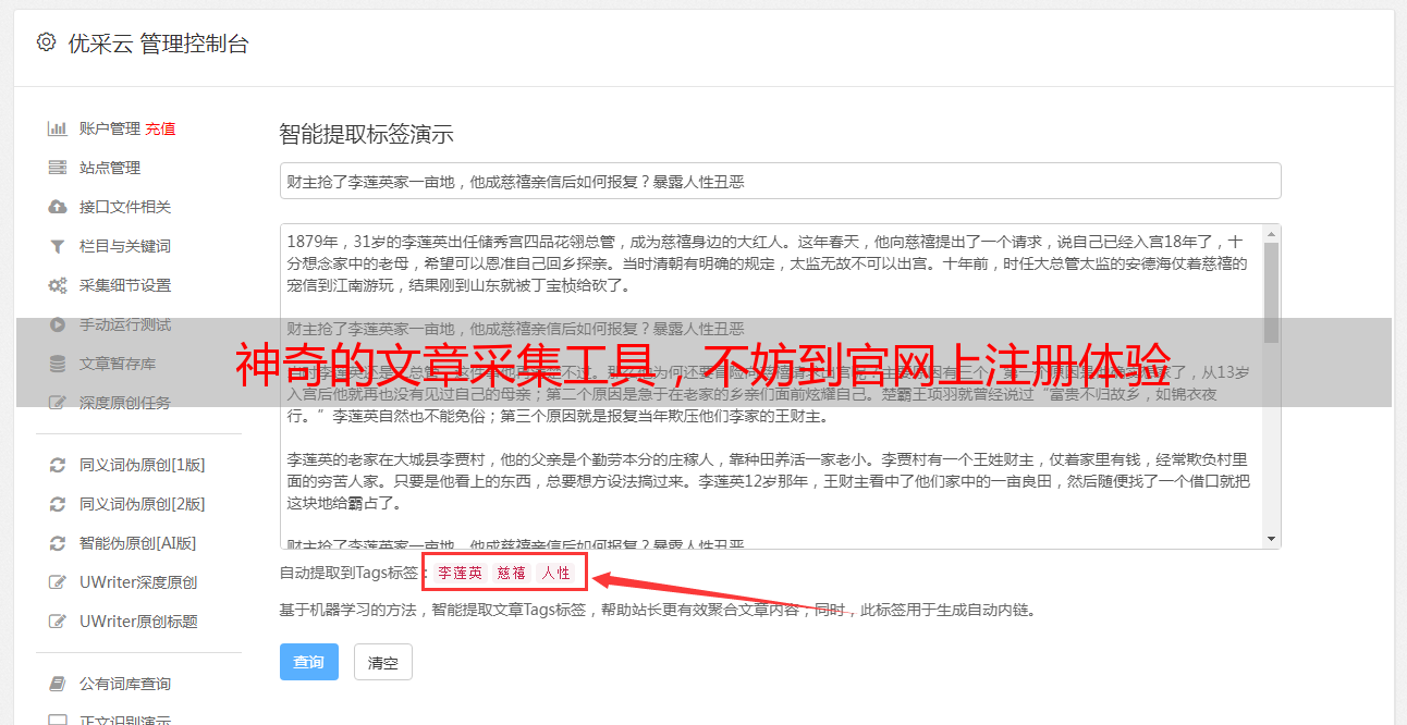 总之,优采云是一款非常实用的文章采集工具,能够大大减少SEOer们对文章采集工作所耗费的时间和精力。如果你也想要尝试一下这款神奇的文章采集工具,不妨到官网www.ucaiyun.com上注册体验一番吧!