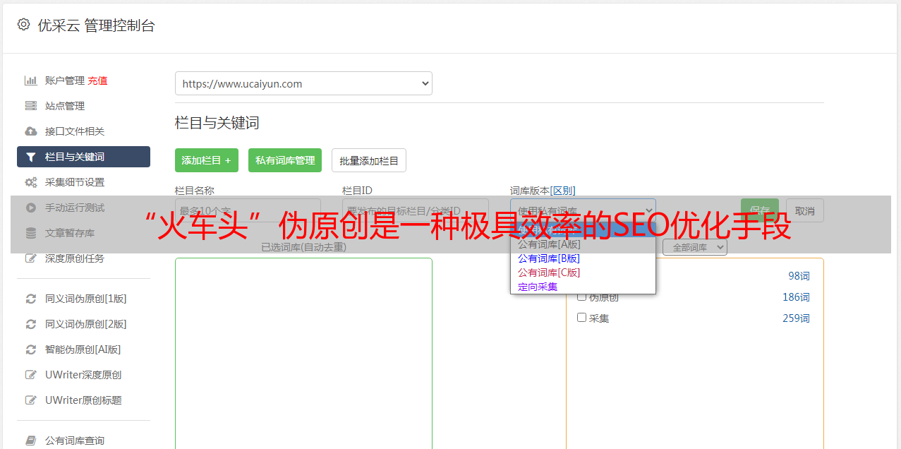 总之,随着市场竞争日益激烈,SEO 优化已成为一门必修课。而“火车头”伪原创正是一种极具效率的 SEO 优化手段,尤其是通过 UCaiyun SEO 优化软件(www.ucaiyun.com)来生成文章时投入就能得到想要的回报。
