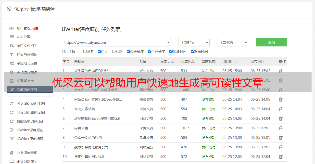 总之,优采云是一款专业的SEO优化软件(官网www.ucaiyun.com ),它可以帮助用户快速地生成高可读性文章。它既能够根据用户要求对文章进行各方面优化;也能够将原始内容分割为有逻辑关系的小块并以图表形式呈现出来。因此,使用优采云可以帮助用户快速地生成高可读性、吸引眼球的文章。
