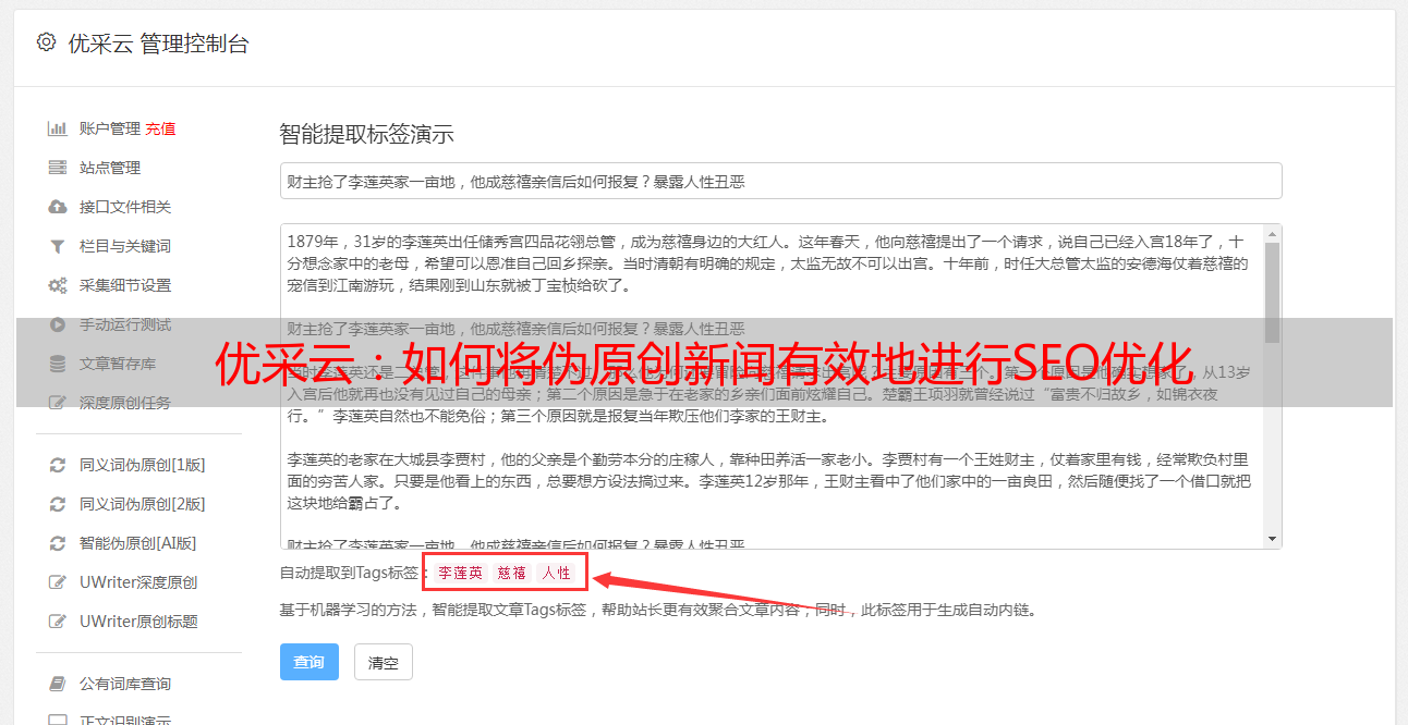 首先,通过优采云搜索引擎,可以快速检索出相关领域中各种文章资源,并将其收集归类。然后,借助语义理解、语义树以及语义相关性对已收集的内容进行特征识别和理解。最后,根据SEO要求和内容要求对内容进行重新拼凑、生成、修正,以便生成看上去有独特性、有吸引力的内容。