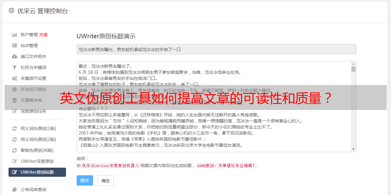 优采云是一款强大的英文伪原创工具,它可以有效提高文章的可读性和质量。它能够帮助用户根据自己的需要对文章进行批量处理,并且可以根据不同的主题生成不同的内容。此外,它还可以通过SEO优化技术来帮助用户提升文章在搜索引擎中的排名。