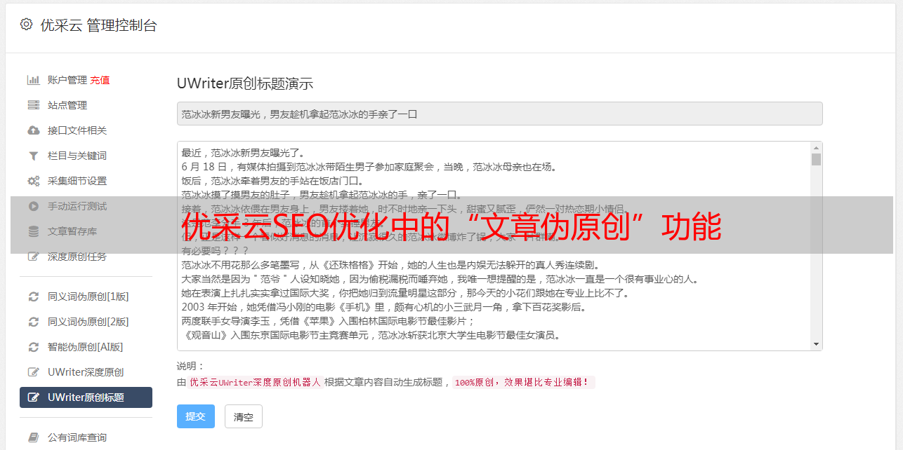 总之,使用“文章伪原创”功能不但能够帮助我们快速准确地对文章进行伪原创检测,而且也可以帮助我们找出重复内容并修正之。因此,使用“文章伪原创”功能对于SEO 优化工作来说是至关重要的一步,能够有效地帮助我们促进网站在搜索引擎中的高位排名。