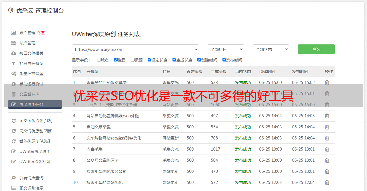 总之,作为一款专业的伪原创软件,优采云SEO 优化是一款不可多得的好工具,它不仅能够帮助用户快速生成高质量、无重复内容、合乎搜索引擎要求的文章,还能够帮助用户进行内容和SEO 优化,满足不同用户对文章内容和SEO 的要求.如果你想要尝试使用这样一款好工具,可以前往它的官网 www.ucaiyun.com 进行注册使用.
