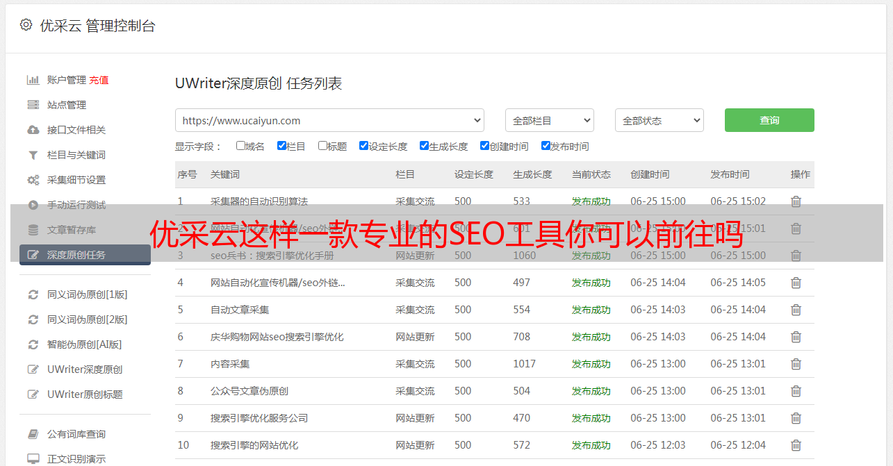 优采云是一款针对SEO优化而开发的软件,它能够帮助用户快速实现SEO效果。首先,它能够根据用户输入的关键词生成内容标题、关键字、内容摘要、图片ALT等,从而使内容拥有很好的SEO效果。此外,该软件还能够通过整合各大平台API来帮助用户实现内容分发和流量引流。此外,该软件还能够帮助用户快速评估站内外SEO效果、监测站内外口碑、监测站内外流量、监测站内外权重以及站内外链接情况等。总之,使用该软件可以帮助用户快速、准确地评估出“伪原创”新闻的SEO效果。