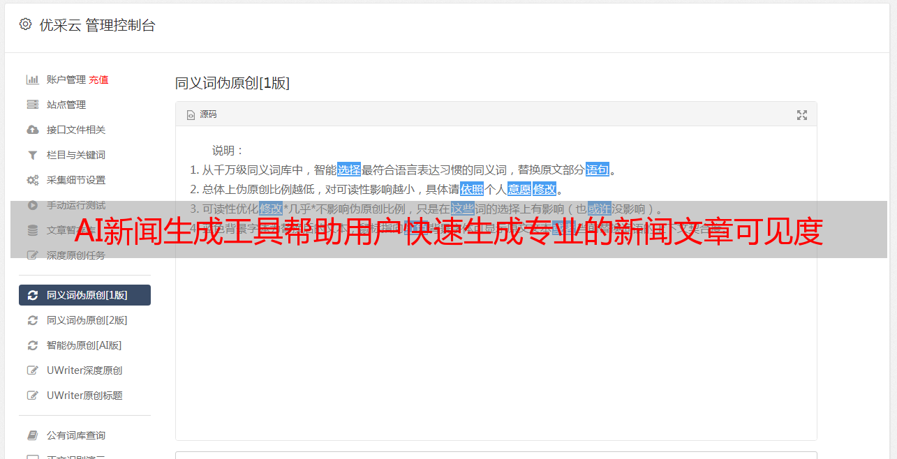 优采云 发布时间: 2023-02-04 08:35AI新闻生成工具是一款基于人工智能技术的新闻写作软件,可以帮助用户快速生成专业的新闻文章。它可以根据用户的要求快速生成出新闻稿,而且还能够自动进行SEO优化,将文章自动优化到搜索引擎中,大大提高文章的可见度。
