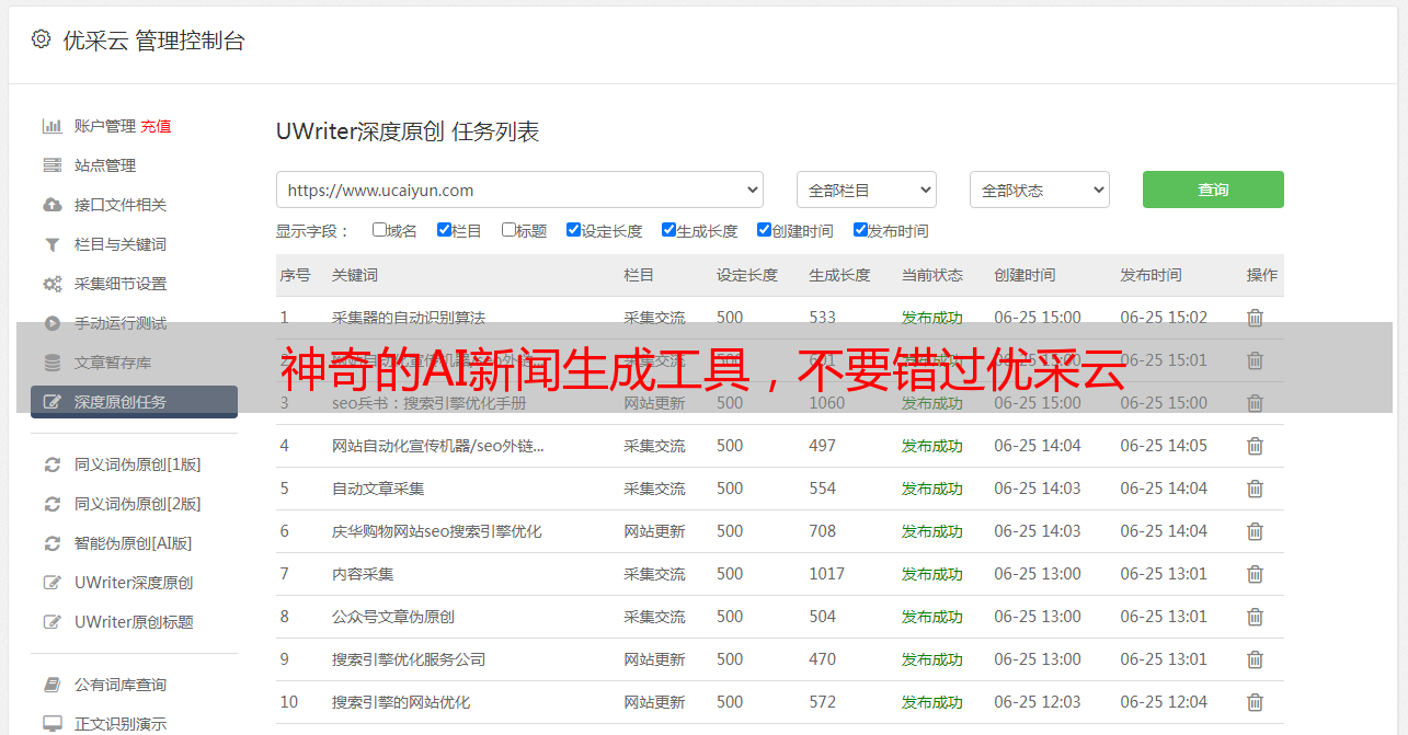 总之,随着人工智能技术的发展,AI新闻生成工具将带来前所未有的方便性。如果你正在寻找一个强大、高效、易用、易上手的AI新闻生成工具,就不要错过优采云。它将带来无限惊喜!如果你想要尝试一下这个神奇的AI新闻生成工具,请访问www.ucaiyun.com 下载体验吧~