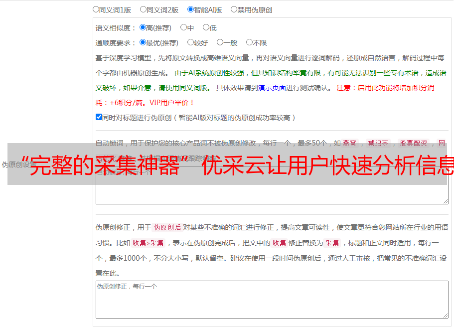 首先,优采云具有强大的SEO优化功能,能够有效地帮助用户进行站内SEO优化。它可以根据用户设定的关键词帮助用户快速分析站内文章与该关键词的相关性;同时也可以根据站内文章中使用的关键词来判断文章是否存在异常情况。此外,它还可以根据相关规则进行站内文章的自动生成;此外,它还可以对站内文章进行快速批量修改、批量生成Meta标签等。
