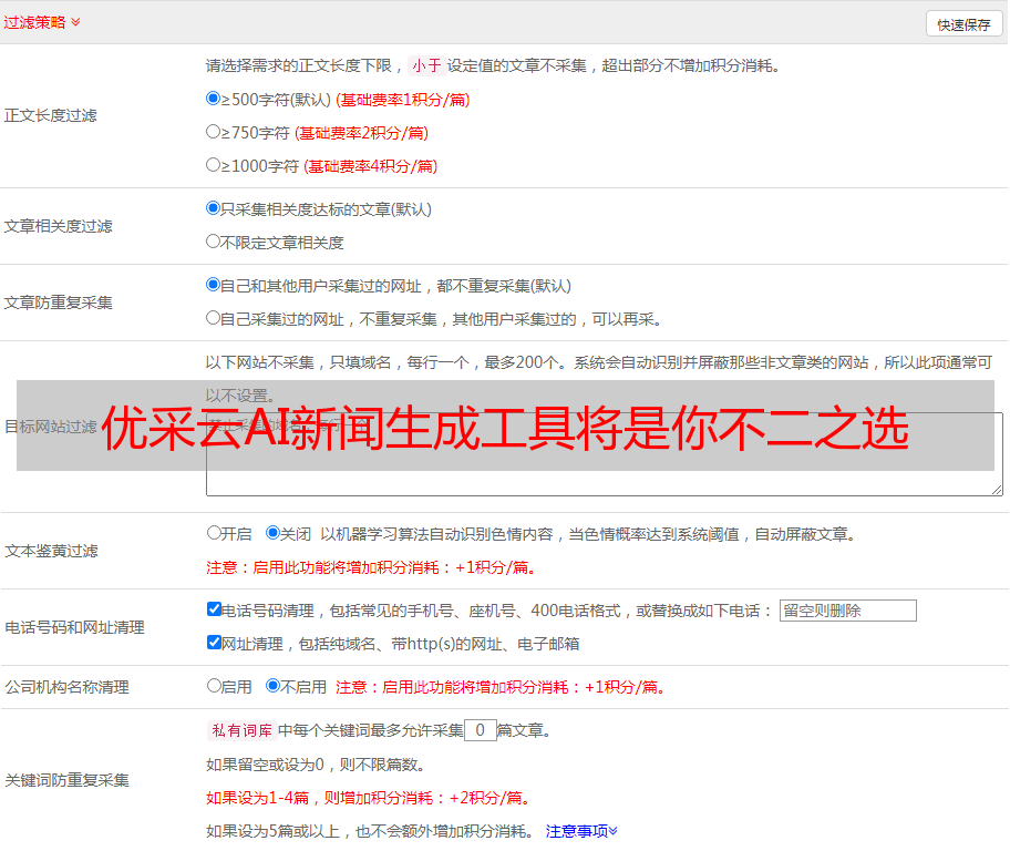 此外,优采云 AI 新闻生成工具还有一个很重要的特性:可以根据用户的要求对文章进行定制化处理。例如,用户可以根据不同的业务场景、不同的行业环境、不同的语言风格等条件来定制化处理文章。这样一来,文章就能够得到最佳的 SEO 优化效果。