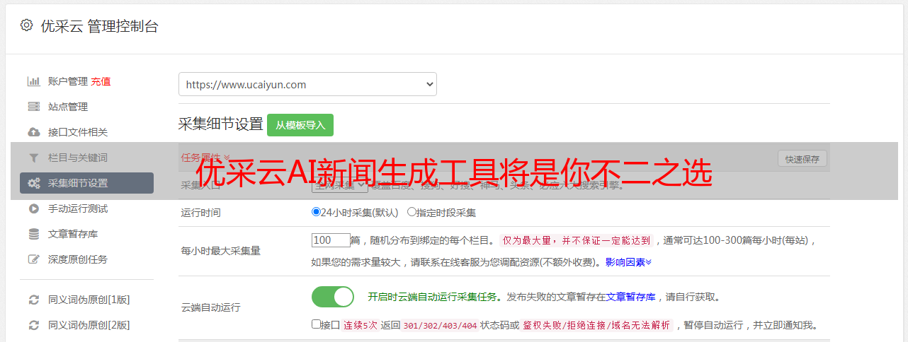 总而言之,优采云 AI 新闻生成工具是一个强大而又高效的工具,能够帮助用户快速生成专业水平的新闻内容;同时也能够有效地帮助用户对内容进行 SEO 优化。如果你正在寻找一个能够帮助你快速、有效地生产、编辑和优化新闻内容的 AI 技术工具,那么优采云 AI 新闻生成工具将是你不二之选。它将是你无法想象中最佳的帮手。想要了解更多信息?请浏览www.ucaiyun.com 官网了解详情吧。