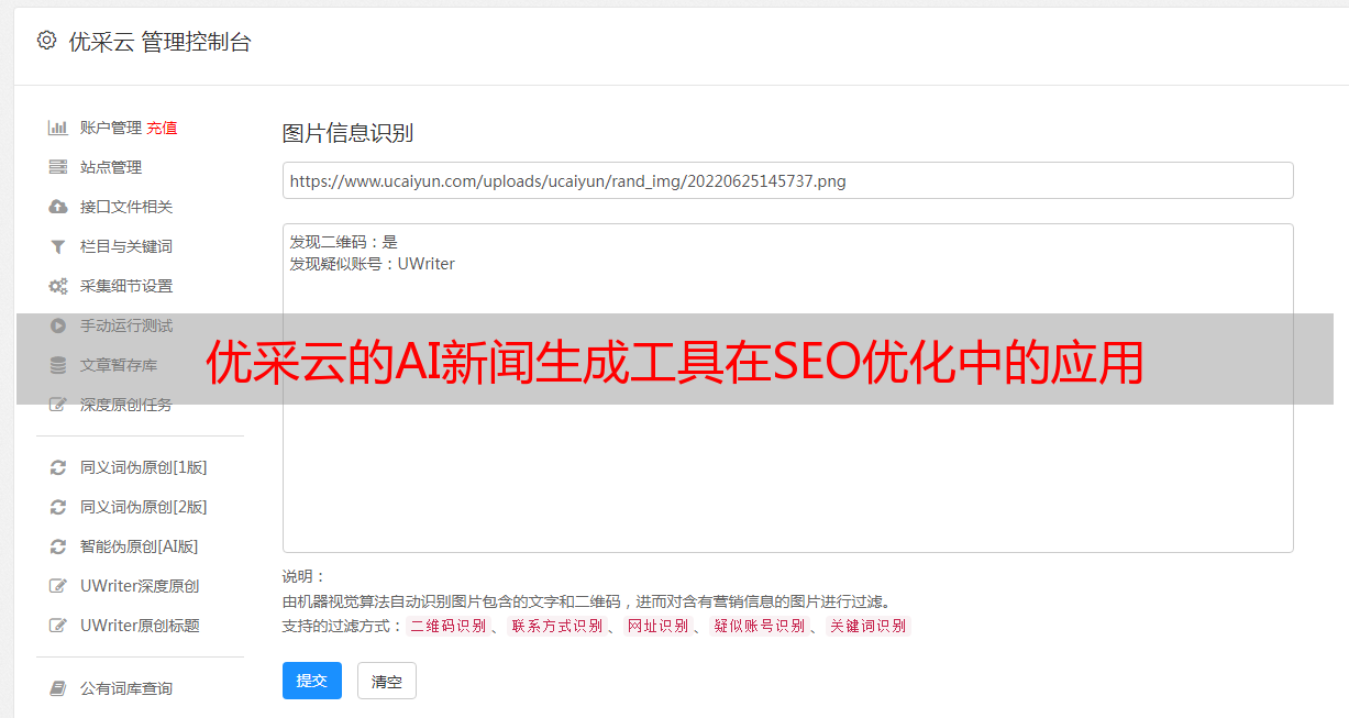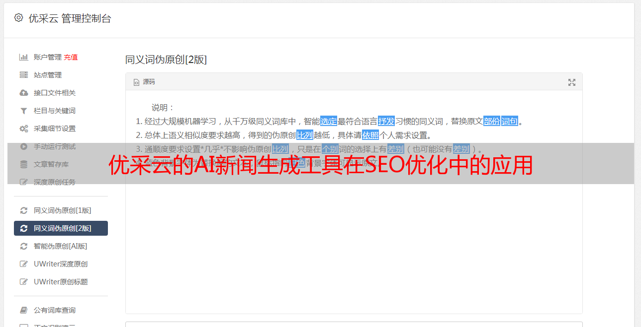 优采云是一家集AI技术、SEO优化、大数据分析为一体的新型企业,致力于为客户提供AI新闻生成工具。该工具既可以快速生成新闻内容,又能够根据客户的要求进行SEO优化,帮助客户轻松地将新闻发布到各大平台。