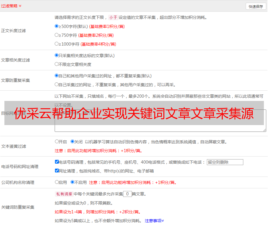 优采云是一款专门用于帮助企业实现关键词文章采集的软件,它可以帮助企业从各大搜索引擎中快速准确地获取关键词文章内容,并将其存储到数据库中,以便日后使用。此外,优采云还能够帮助企业实现SEO优化,可以根据关键词及相关信息,准确地对文章内容进行分词、分类和标注,有效地将文章内容提升到搜索引擎前列。