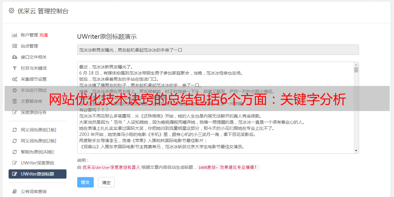 优采云 发布时间: 2021-06-08 01:42网站优化技术诀窍的总结包括6个方面:关键字分析