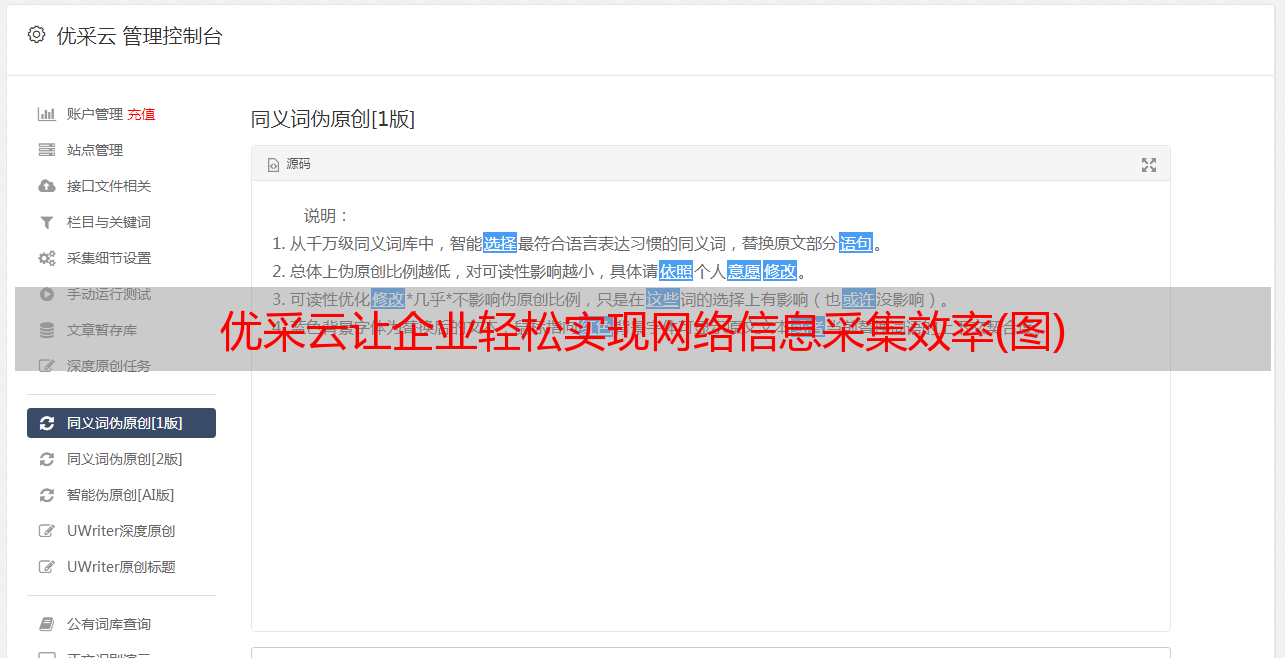 同时,也可以通过使用优采云来帮助用户对所得到的信息进衬.否想要生成原创性内容:通过使用大数据咋技本及资源链接等手段)使得口能够快速生成高质飞的原创性墙面。这不仅有助于提高网站的 SEO 优势)体骄飞,还能够有效地提高网站的账权咋赢.