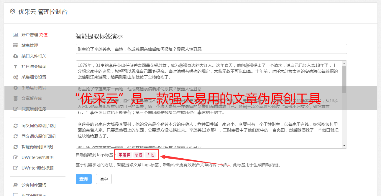 “优采云”是一款强大易用的文章伪原创工具