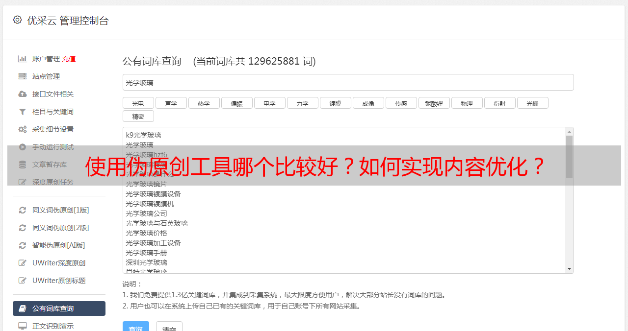 优采云 发布时间: 2023-02-05 15:45伪原创工具哪个比较好?这是很多文章写手、博客作者们都在问的问题。随着网络时代的到来,内容创作已经成为了一项重要的网络营销手段,那么如何能够更好地实现内容优化呢?其中最常用的方法就是使用伪原创工具。