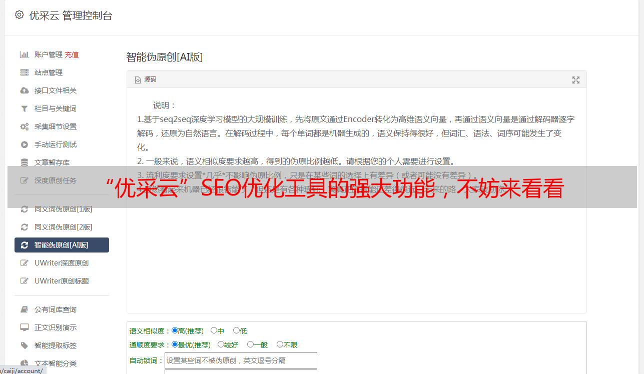 总之,“优采云”SEO优化工具是一个功能强大而且实用性很强的工具,它不仅可以帮助用户快速发现文章中存在的重复内容,而且还能帮助用户准确无误地识别出文章中是否存在伪原创。如果你想要体验一下“优采云”SEO优化工具的强大功能,不妨来它官网www.ucaiyun.com上看看吧~