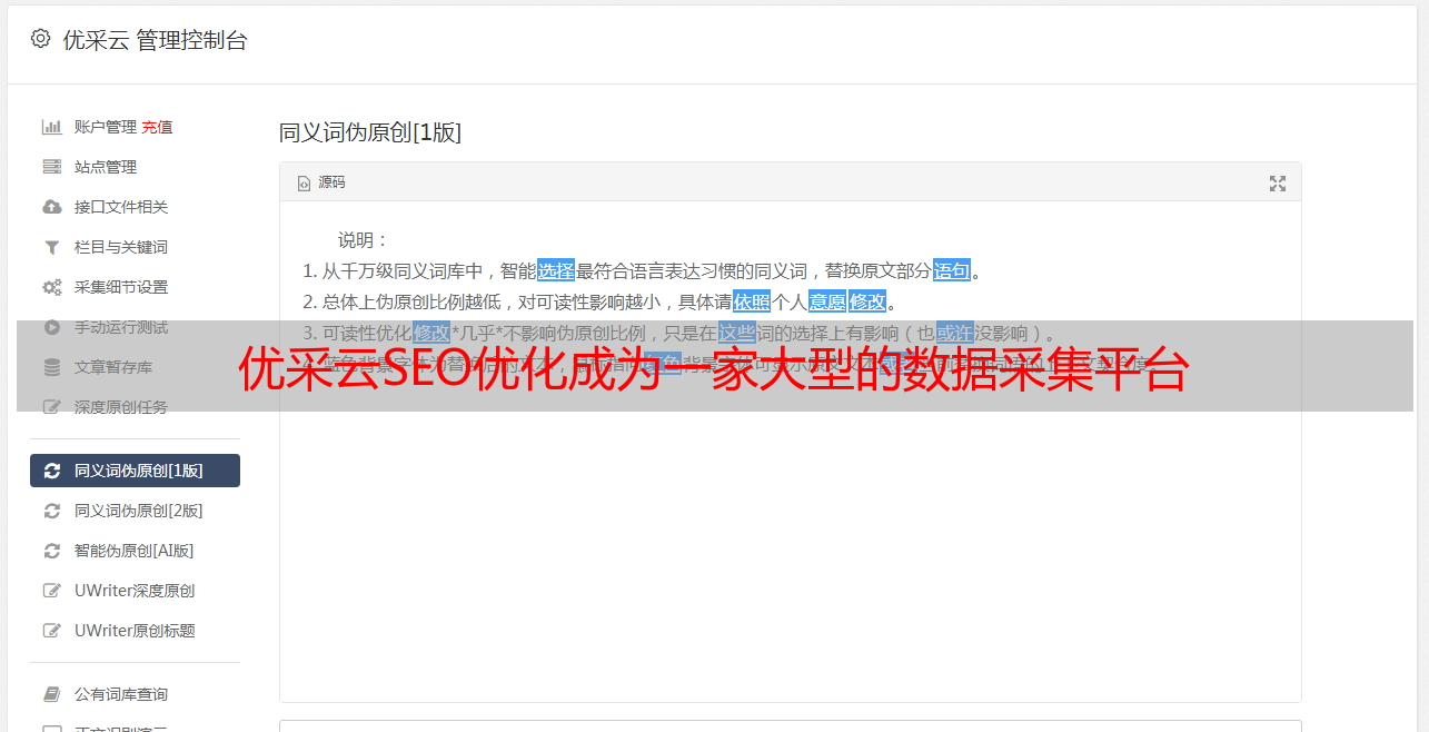优采云SEO优化是一家大型的数据采集平台,它专注于为各行各业的企业提供高质量、高性能的数据采集服务。该平台使用先进的软件技术开发出了一套安全、灵活、易用的数据采集器,使得各行各业的企业能够轻松快速地获取电子信息。此外,优采云SEO优化还具备出色的数据处理能力,能够将所获取的信息进行高效地处理和分类,使得企业能够快速准确地获取所需要的信息。