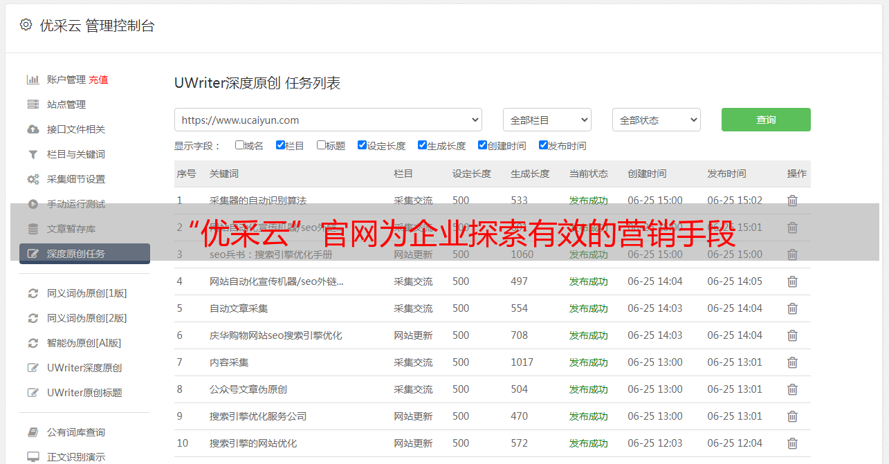 对于想要从事伪原创*敏*感*词*工作的人来说,有一些必备的要求。首先是写作能力:申请者必须能够很好地表达思想,能够根据所需内容迅速准确地表述思想;其次是SEO相关能力:申请者必须能够理解SEO相关的各项内容和要求,并将理解应用到文章中。此外,申请者还应该对各种相关工具有一定的了解,例如“优采云”是一款集文章采集、整合、发布、SEO优化于一体的应用。可以帮助用户快速、高效地实现内容创作所需。通过“优采云”可以快速将文章上传并发布到多平台上。“优采云”官网www.ucaiyun.com上也有大量教学文章供大家参考学习。