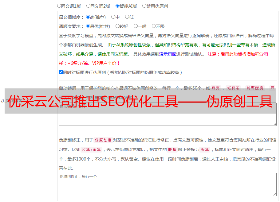 随着SEO行业日益发展壮大,SEO优化已成为市场上不可或缺的一部分。作为一款高效便捷的SEO优化工具,伪原创工具1.7.6将是帮助大家快速准确地进行SEO优化、强化新闻内容效果和凸显产品形象的不二之选。如需了解详情,欢迎前往优采云官方网站www.ucaiyun.com 浏览相关信息。