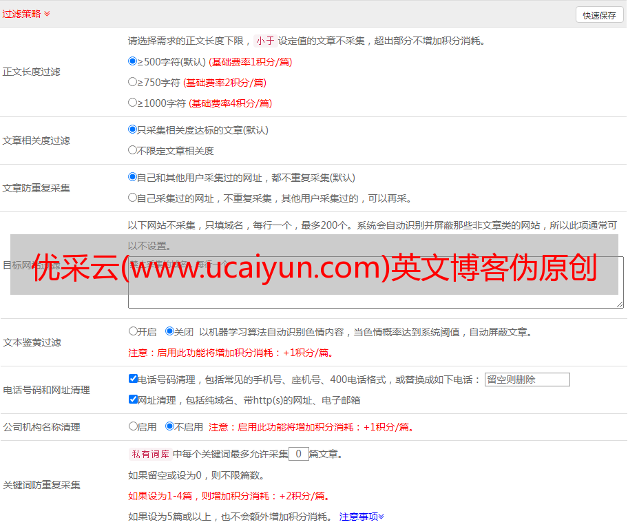 此外,在进行英文博客伪原创时,应该注意避免重复使用相同的语句和信息。为了避免出现大量相似、重复的内容,有必要使用一些SEO优化工具来帮助优化文章中的信息。例如优采云(www.ucaiyun.com)就是一款SEO优化工具,可以帮助用户对博客文章中使用到的所有词语进行优化,从而避免重复使用相同内容。
